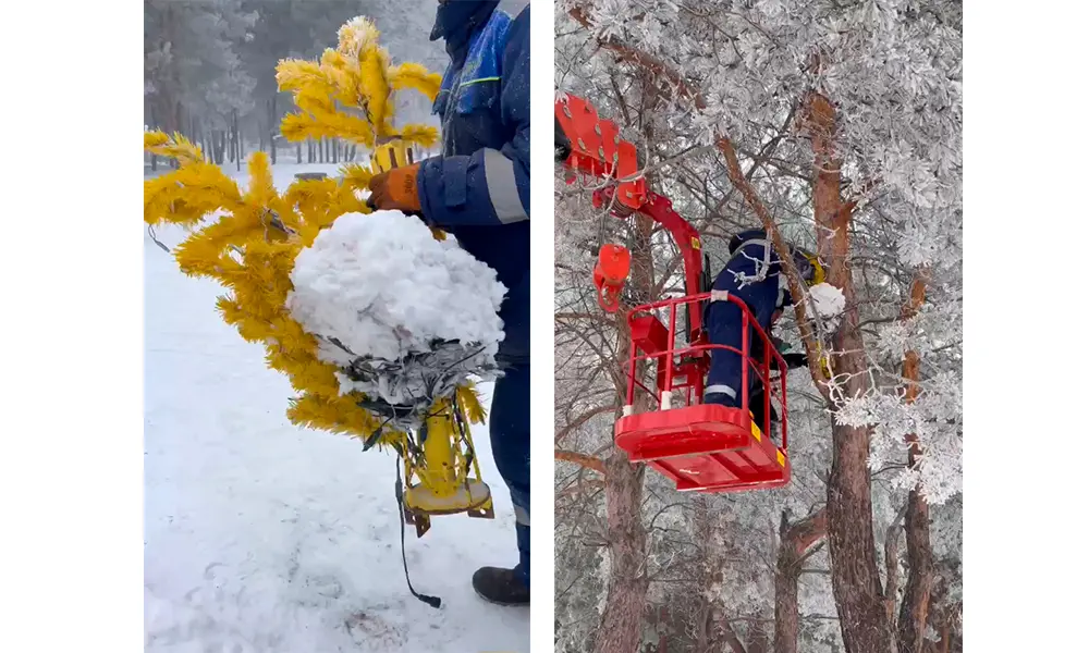 Работники подрядной организации сняли гнездо с бельчатами и закрепили его на ближайшей сосне.