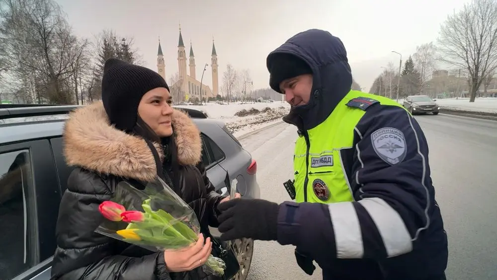 Сотрудники Госавтоинспекции вышли сегодня на дороги Нижнекамска, чтобы поздравить женщин-водителей с наступающим Международным женским днем.
