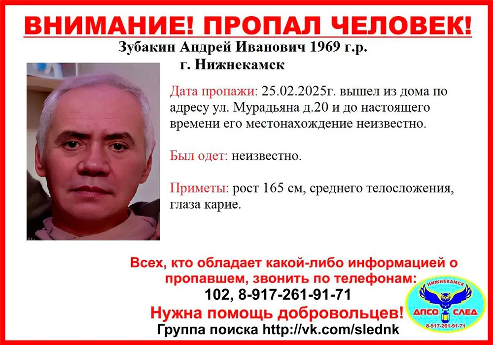 В Нижнекамске пропал 55-летний Андрей Зубакин.
