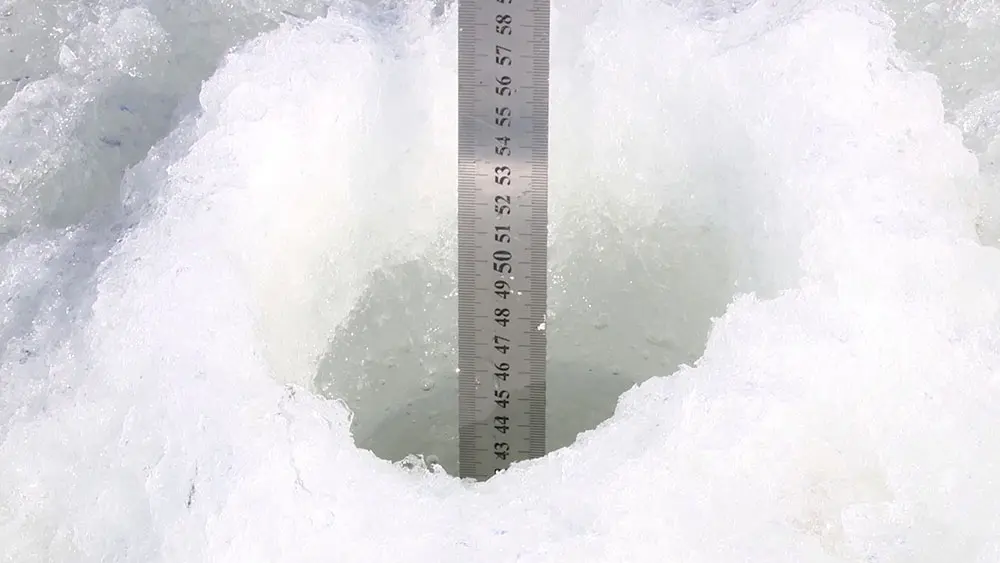 Лед на озере Долгое уже рыхлый, бур еле справляется со своей задачей. Но это только на поверхности, ближе к воде ледяная корка еще прочная. Сначала для безопасности замеры инспектор производит ближе к берегу. Там лед толстый, впрочем, прочный он пока еще и в середине озера.