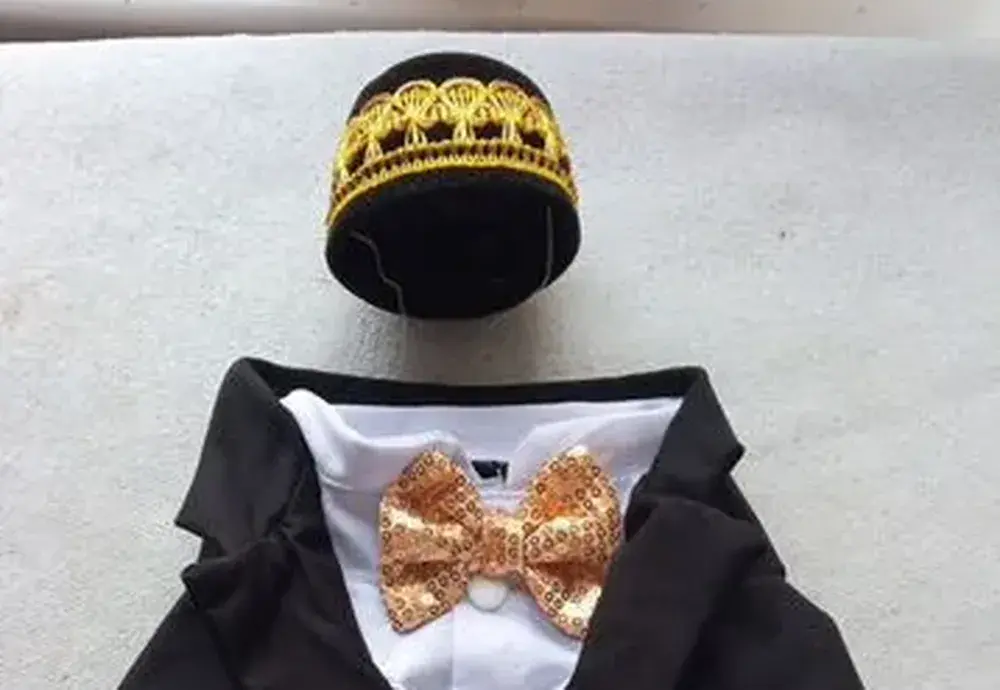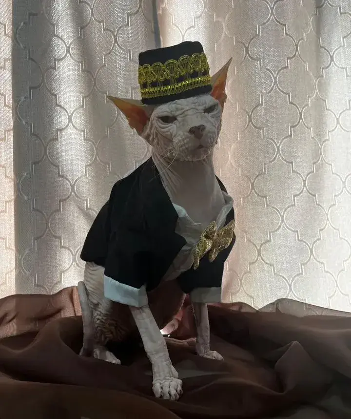 В комплект костюма входят смокинг с галстуком-бабочкой и тюбетейка. В качестве модели продавец опубликовала фото кота породы сфинкс, одетого в данный костюм и татарский головной убор.
