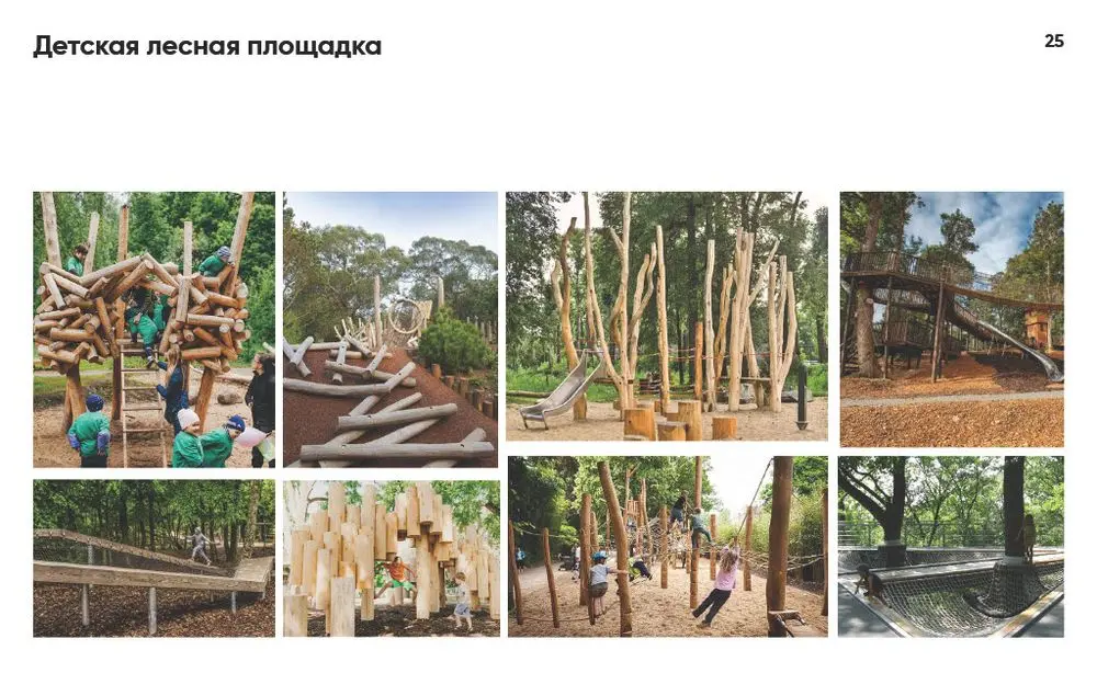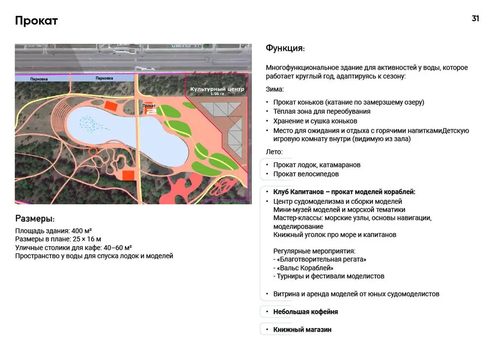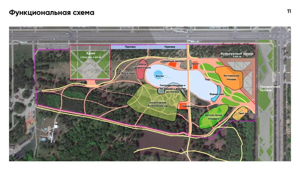 Согласно представленному концепту, парк будет разделён на несколько зон, учитывающих интересы разных групп его посетителей: рекреационная зона (пляжи, места для пикников, зоны тихого отдыха), активная зона (площадки для активных игр, беговые и велодорожки, культурная зона (культурный центр, фестивальная площадка).