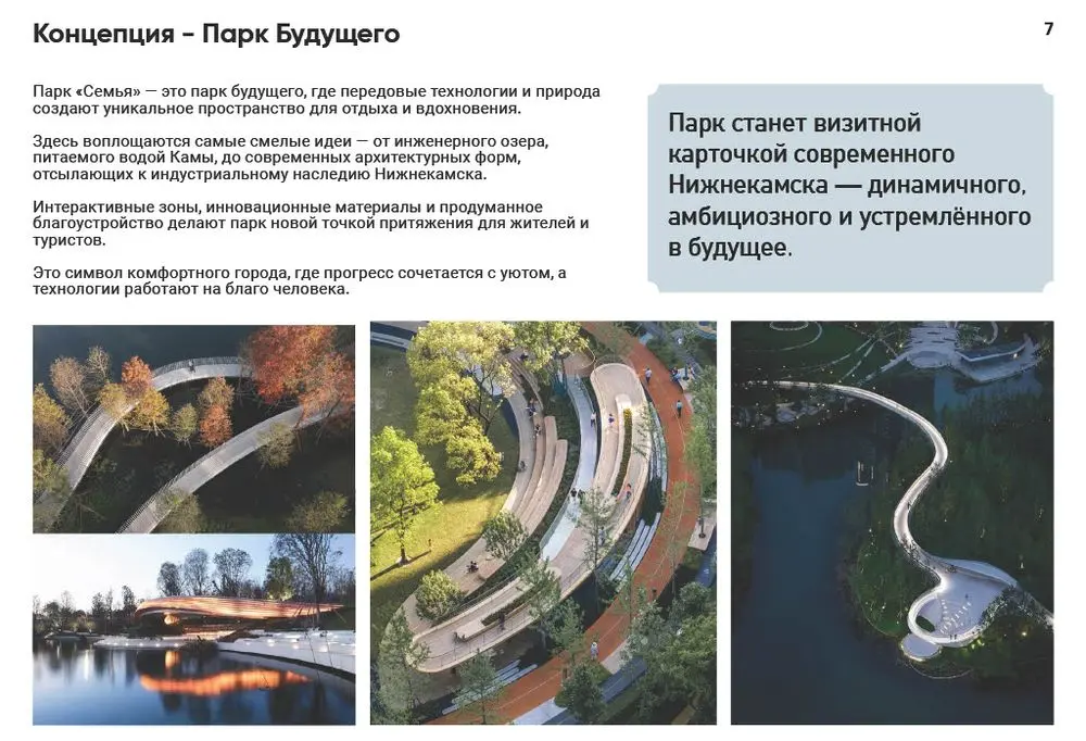 В основе концепции лежит идея парка будущего, где сочетаются инновационные инженерные решения и природа. «Семья» должна стать визитной карточкой динамичного и современного Нижнекамска.