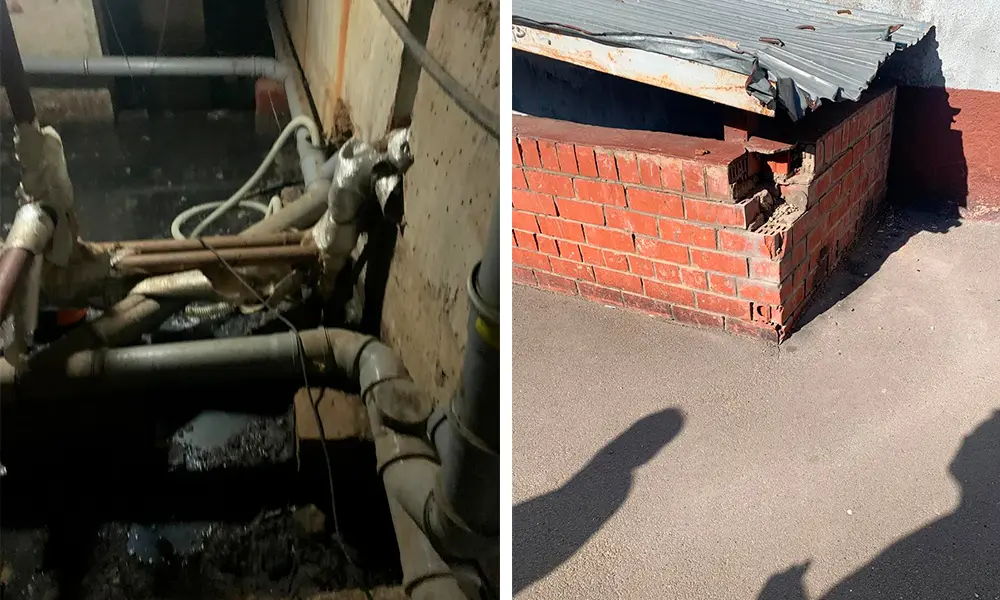 Кроме того, инспекторы зафиксировали систематические засоры в системе водоотведения, подтопления и мусор в подвале, неисправность теплоизоляции трубопроводов, отсутствие санобработки мусоросборной камеры, разрушение парапета на крыше и штукатурки на фасаде, необеспечение беспрепятственного отвода воды от наружных стен и проч.