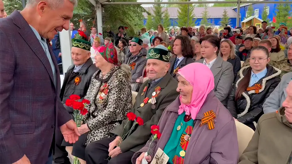 Перед началом торжественной церемонии глава республики лично поприветствовал ветеранов, присутствовавших на мероприятии в качестве почетных гостей. Особую атмосферу событию придало участие местной жительницы Мадины Нуруллиной, которая принесла с собой сохранившуюся с военных лет фотографию, ставшую живой связью с героическим прошлым.