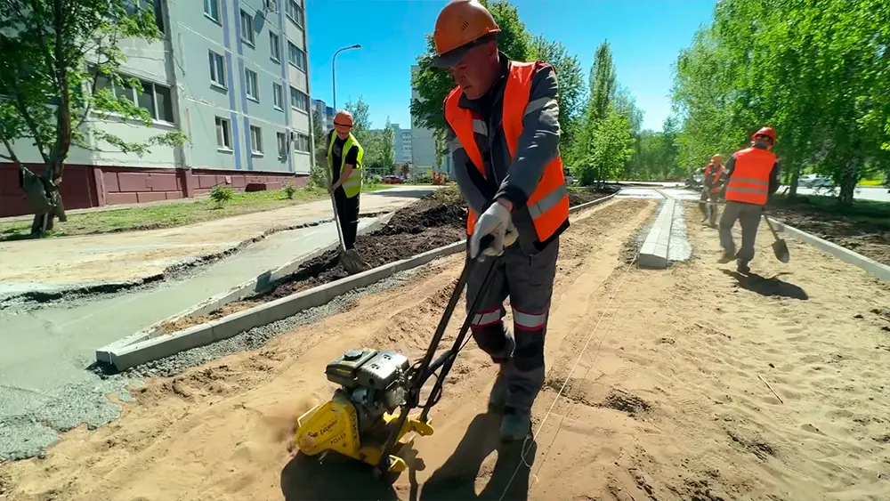 В прошлом году после замены труб тепло- и водоснабжения территория за домом № 33 по улице Баки Урманче тоже доставляла неудобства жильцам, особенно школьникам и воспитанникам детского сада. На променаде сегодня ведутся работы по восстановлению тротуарной плитки. Рабочие устанавливают бордюры и подготавливают полотно к укладке брусчатки.