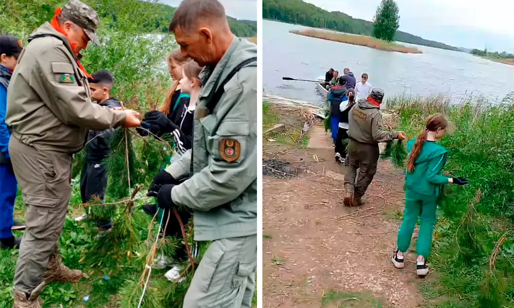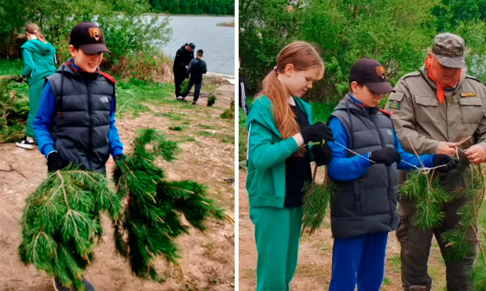 Вместе со специалистами ребята готовили «сосновый венок», связывая ветки для того чтобы, отправить их на озеро. В этих ветках отложенные икринки, будут защищены от высыхания и хищников.