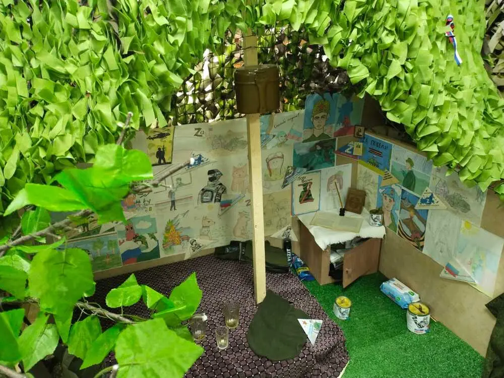 Музей, посвященный СВО расположился в соседнем кабинете. Там уже представлены современные элементы военной формы, гуманитарная помощь, маскировочные сети. Дети и учителя своими руками сделали инсталляцию блиндажа, внутри которого детские рисунки, окопные свечи, уголок для молитвы. А на стене развешаны фотографии бойцов СВО — все эти ребята жители села Старошешминск. Некоторых из них уже нет в живых, а другие служат и их ждут дома.