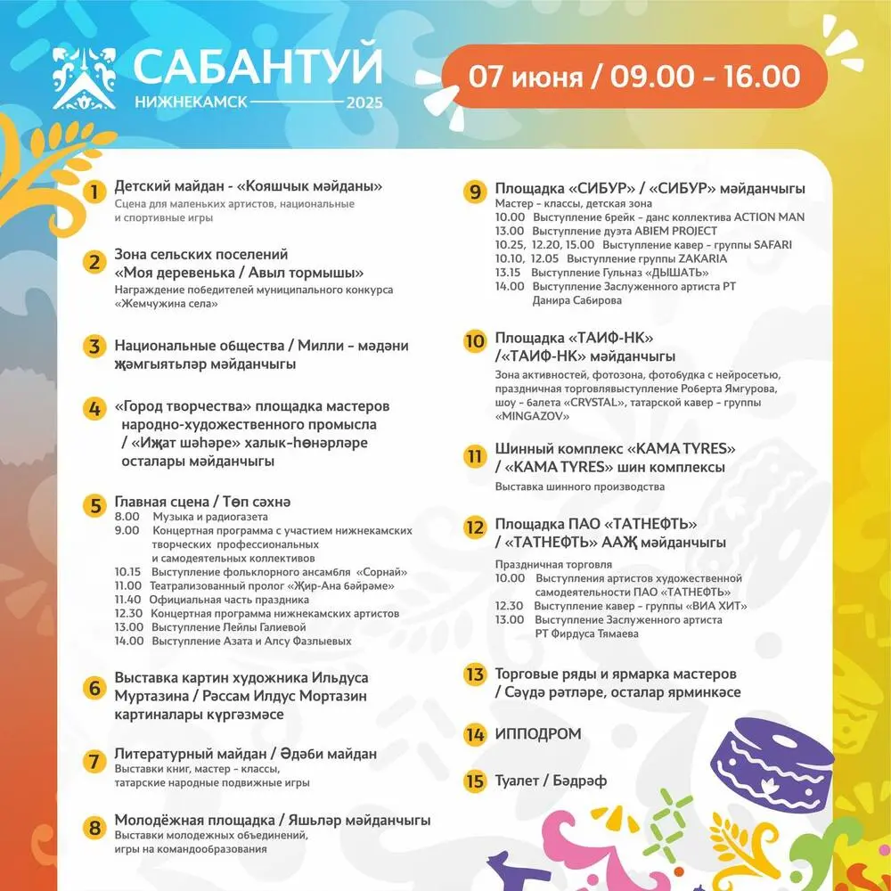 На площадке шинного комплекса «КАМА TYRES» пройдёт выставка шинного производства. А на площадке ПАО «ТАТНЕФТЬ» с 10:00 начнут выступать артисты художественной самодеятельности, в 12:30 на сцену выйдет кавер-группа «ВИА ХИТ», а в 13:00 — заслуженный артист РТ Фирдус Тямаев.