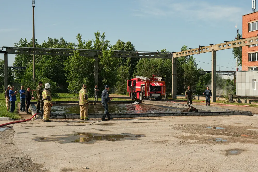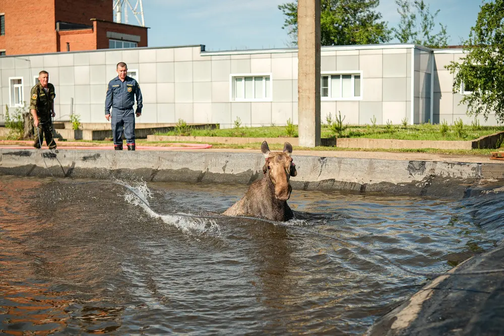На территорию промышленной зоны Нижнекамска около шести часов утра 5 июня забрёл молодой лось. Там он угодил в водоём и не смог самостоятельно выбраться.