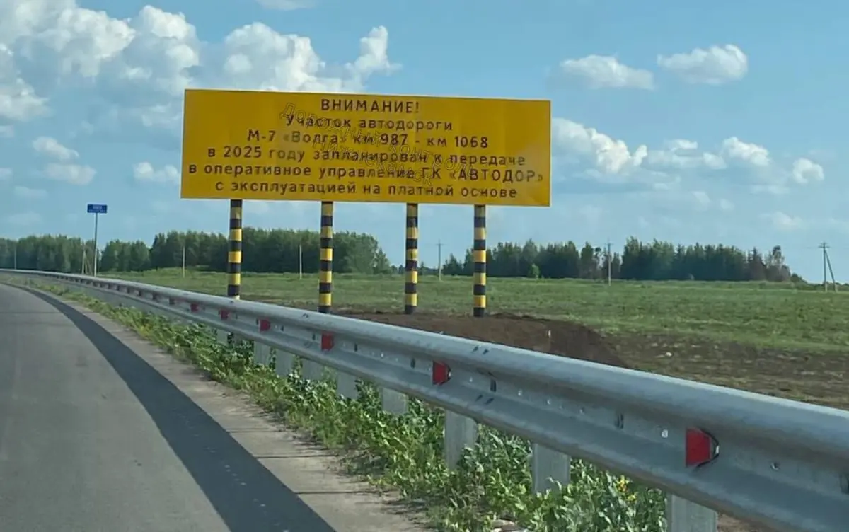 «Татмедиа» со ссылкой на очевидца сообщает, что на трассе установили табличку, информирующую о том, что «участок автодороги М-7 „Волга“ км 987 — км 1 068 в 2025 году запланирован к передаче в оперативное управление ГК „Автодор“ с эксплуатацией на платной основе».