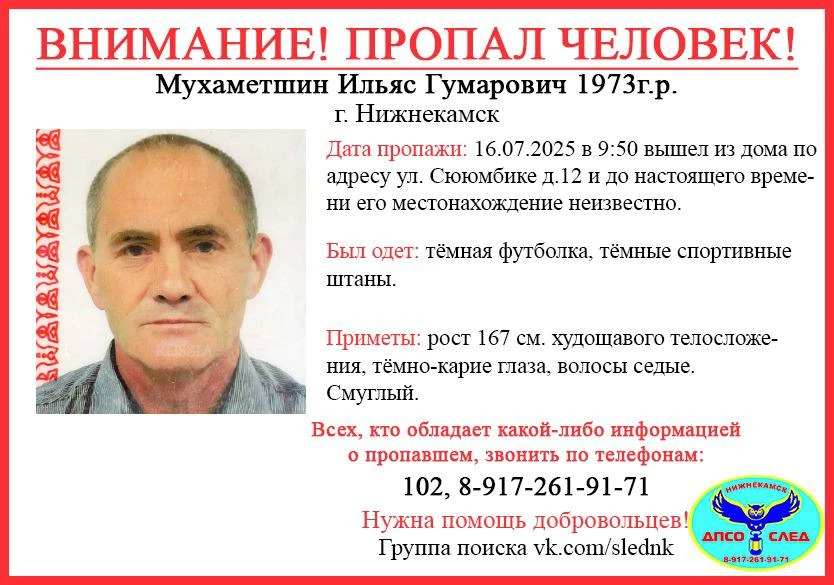 Мужчина в 9:50 часов утра 16 июля вышел из дома № 12 по улице Сююмбике, и с тех пор его местонахождение неизвестно. Он был одет в тёмную футболку и тёмные спортивные штаны.