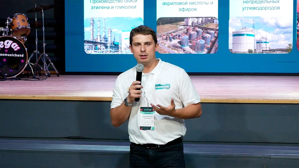А затем участники приступили к защите проектов по самым разным направлениям — цифровизации, энергетике, сокращению производственных затрат. Шесть предприятий СИБУРа из Нижнекамска, Казани, Воронежа, Красноярска, Дзержинска и Москвы представили 18 команд. Первой свой проект защищала команда «Пятый элемент» из «СИБУР-Нефтехима». Антон Абламонов работает на предприятии 3 года, и только дебютирует на форуме.