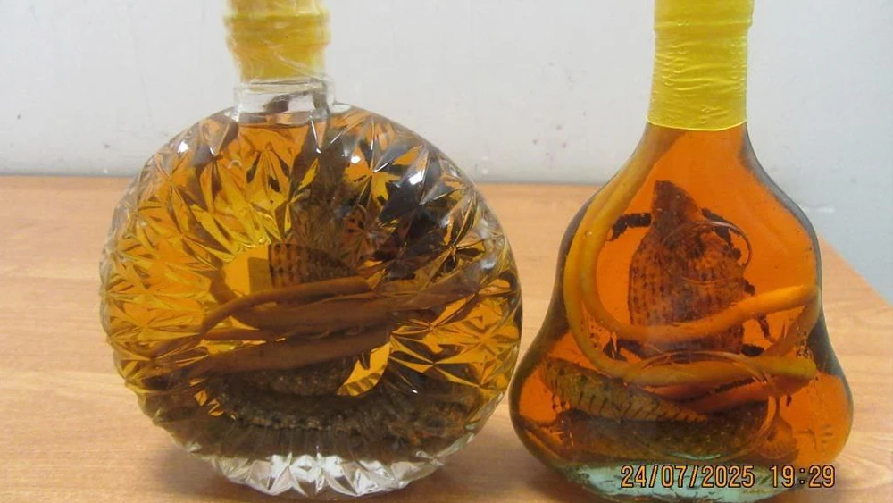 В прозрачных бутылках с жидкостью желтого цвета находились кобра, скорпион и корни растений, рассказали в пресс-службе Татарстанской таможни. Обе женщины следовали «зеленым» коридором без предъявления пассажирской таможенной декларации.