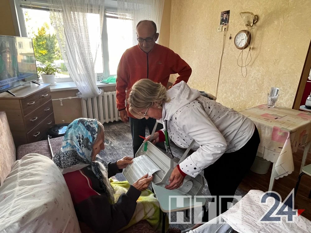 К тем, кто по состоянию здоровья не может самостоятельно посетить избирательный участок, сотрудники УИК выезжают с переносными урнами для голосования.