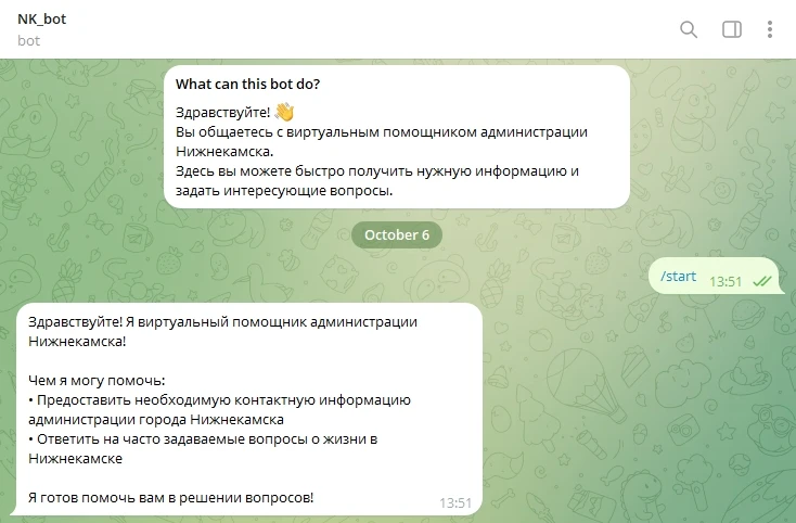 По запросу пользователя бот предоставляет контакты городских служб, справочную информацию, ответы на вопросы, связанные с работой администрации и муниципальных учреждений.