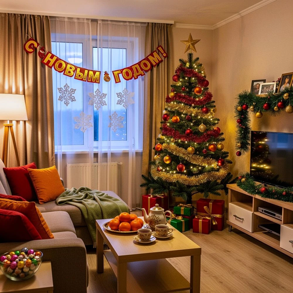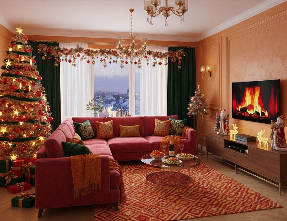 Ёлка в год Красной Огненной Лошади может стать главным акцентом интерьера, если поддержать огненную палитру и добавить немного динамики в декор. Рекомендуются красные и золотые украшения, дополненные зелёными и кремовыми деталями для баланса.