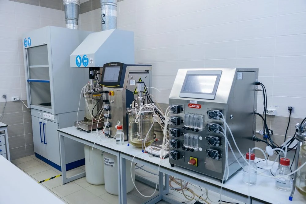 После серии пересевов получают чистую культуру. Затем её масштабируют: сначала в лаборатории, потом в биореакторе — большой «колбе», где автоматически поддерживаются параметры завода-заказчика: температура, подача воздуха, перемешивание. Там бактерии «тренируются» работать с нужными стоками.