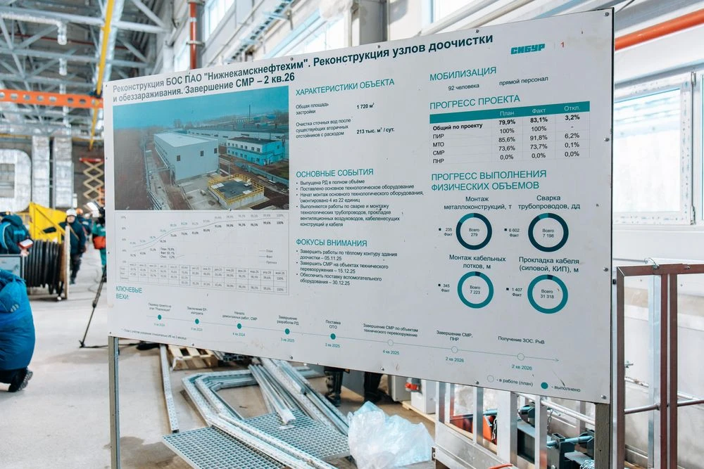 «Работу мы начали в конце 2024 года. На данный момент прогресс у нас составляет 91%. Материально-техническое обеспечение на 97% выполнено, строительно-монтажная работа на 89%. Проектирование завершено. В новогодние праздники также продолжаем работать для ускорения и хотим завершить строительно-монтажную работу весной, перейти уже в пусконаладочную работу», — сообщил руководитель проекта реконструкции БОС «Нижнекамскнефтехима» Ильнар Агзамов.