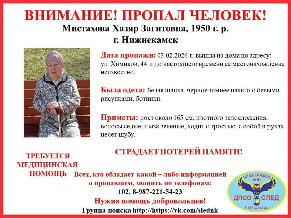 Бабушка вышла 3 февраля из дома № 44 по проспекту Химиков, и с тех пор её местонахождение неизвестно. Она была одета в белую шапку, черное зимнее пальто с белыми рисунками и ботинки.