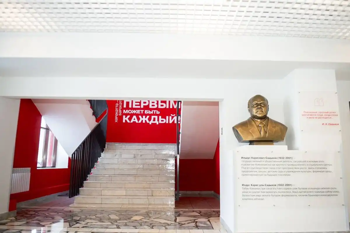 Он также раскрыл некоторые детали о наполнении «Дома Первых». На первом этаже появился бюст почётного гражданина Нижнекамска Ильдуса Садыкова, чьим именем названо учреждение. Стены холла украшают имена активистов «Движения Первых», мотивирующие надписи на двух языках. Второй этаж станет пространством для праздников и важных событий.