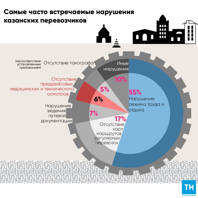 Самые распространенные виды нарушения: нарушение режима труда и отдыха (55%), отсутствие карт маршрутов регулярных перевозок (17%), нарушение ведения путевой документации (7%).