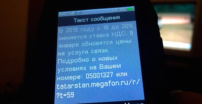 Судя по SMS, которую получают в эти дни клиенты оператора, цены на услуги связи изменятся с 9 января 2019 года. Причина - повышение НДС с 18 до 20 процентов.