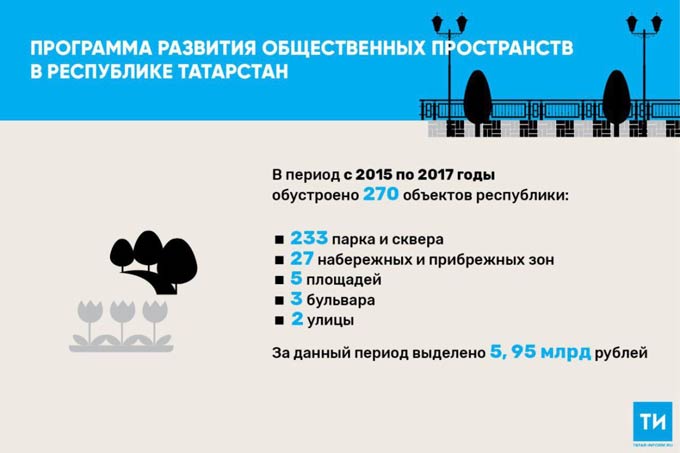 Всего в период с 2015 по 2017 год в Татарстане обустроили 270 объектов, в том числе 233 парка и сквера, 27 набережных и прибрежных зон, 5 площадей, 3 бульвара и 2 улицы. За данный период было выделено 5,95 млрд рублей.