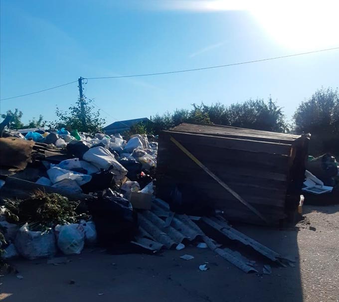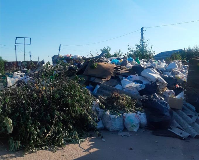 В садовом товариществе по автобусном маршруту №121 на дороге скопилась огромная гора мусора.