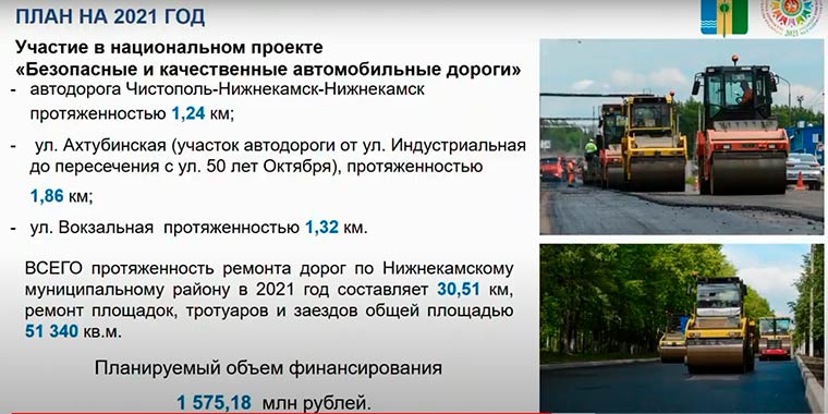 В 2021 году в рамках национального проекта «Безопасные и качественные автомобильные дороги» на территории Нижнекамского района запланирован ремонт более 30 км автодорог.