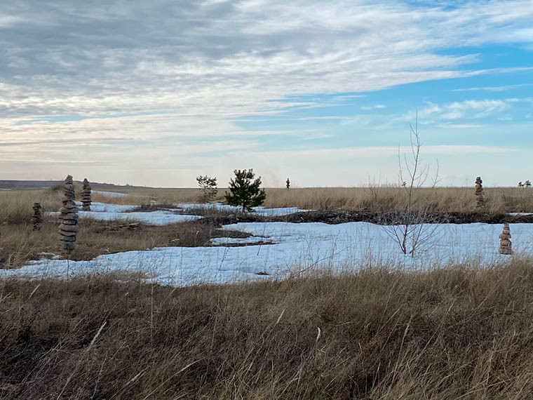 Она представляет собой выложенную булыжниками окружность, в центре которой возвышается башня из камней.