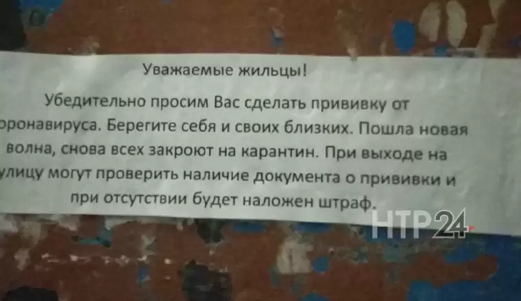 На четвёртом подъезде дома № 30 на пр. Химиков появилось объявление, предупреждающие о якобы грозящих непривитым нижнекамцам штрафах и о предстоящем карантине. Об этом редакции NTR-24.RU рассказала жительница дома.