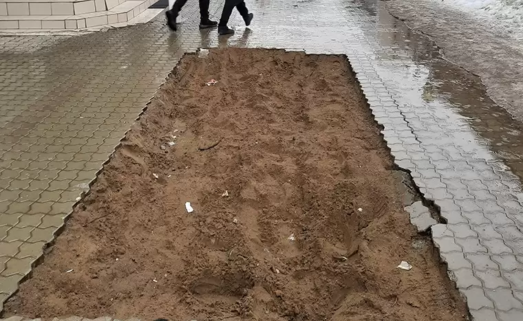 Жители Нижнекамска показали участок отсутствующей брусчатки посреди пешеходной зоны у торгового центра «Пассаж» по улице Юности.