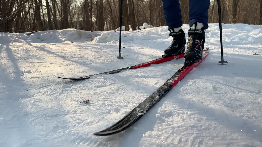 Лыжный спорт идеально подходит для тренировки мышц всего тела. Лыжник со стажем Михаил Былинкин часто выходит покататься в ближайший лес. Сегодня он без лыж, но с палками для скандинавской ходьбы.