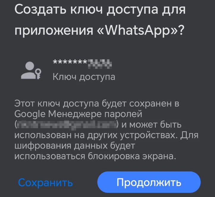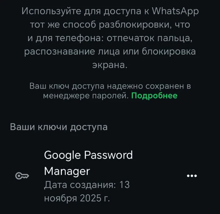 Ключ доступа WhatsApp — это безопасный способ входа в мессенджер без SMS. Он формируется на вашем устройстве через Менеджер паролей Google и хранится локально. Благодаря этому блокировки или проблемы с оператором не мешают войти в аккаунт.