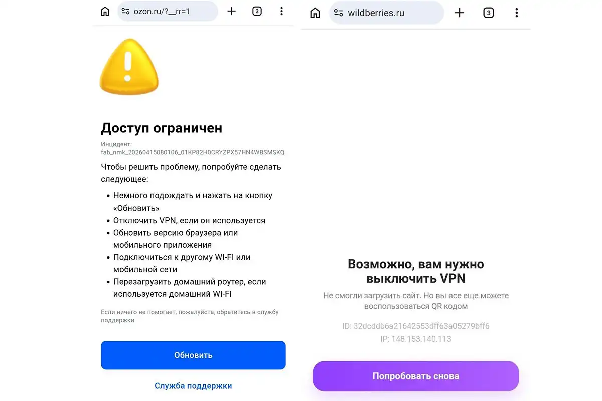 К примеру, сайты маркетплейсов Ozon и Wildberries сегодня не загружаются и предлагают отключить средство смены IP для успешной загрузки, убедился корреспондент НТР 24.