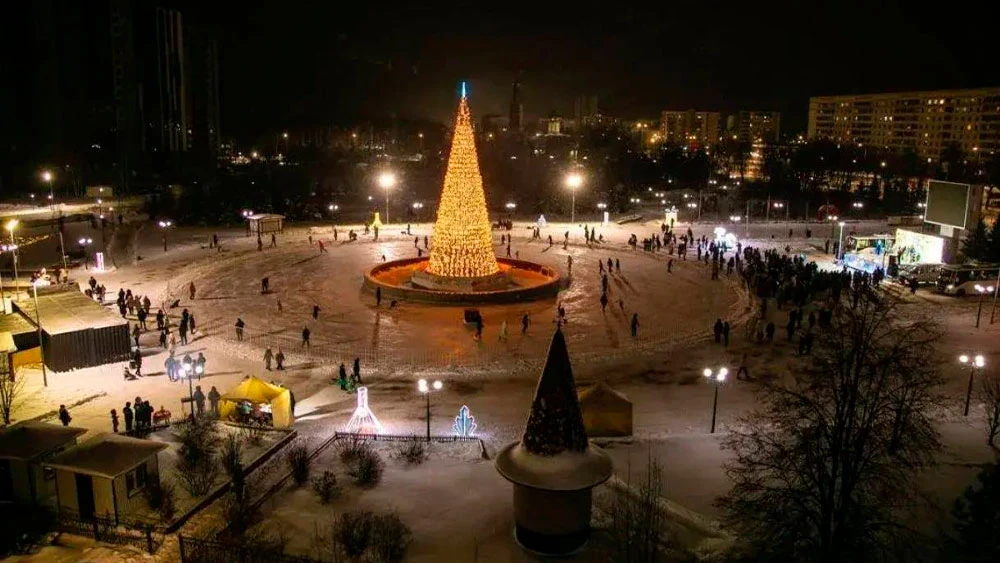 Каток в нижнекамском парке «Нефтехимиков» на проспекте Мира расположен вокруг новогодней ёлки.